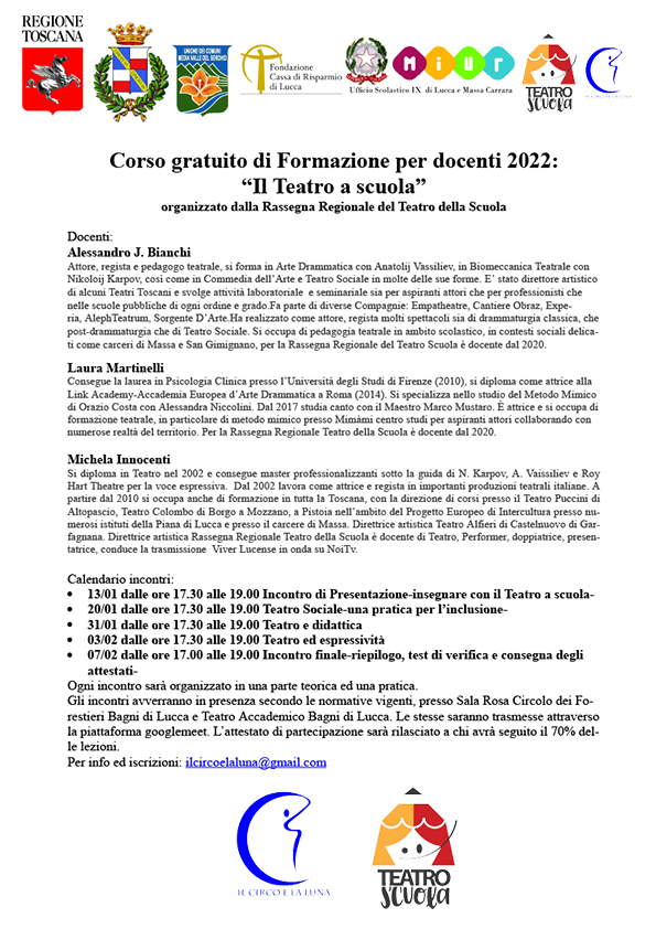 Gli incontri avverranno in presenza secondo le normative vigenti, presso Sala Rosa Circolo dei Forestieri Bagni di Lucca e Teatro Accademico Bagni di Lucca. Le stesse saranno trasmesse attraverso la piattaforma googlemeet. L’attestato di partecipazione sarà rilasciato a chi avrà seguito il 70% delle lezioni.